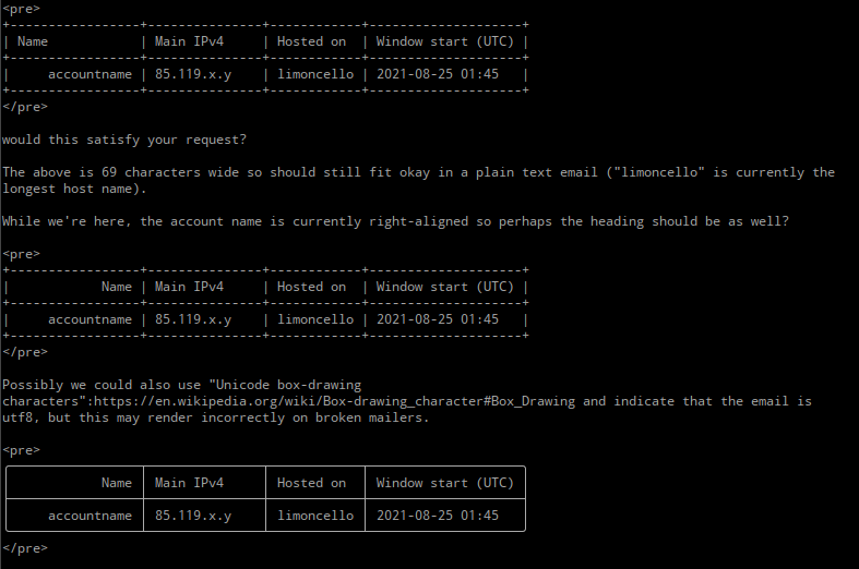 +-----------------+---------------+------------+--------------------+ | Name | Main IPv4 | Hosted on | Window start (UTC) | +-----------------+---------------+------------+--------------------+ | accountname | 85.119.x.y | limoncello | 2021-08-25 01:45 | +-----------------+---------------+------------+--------------------+