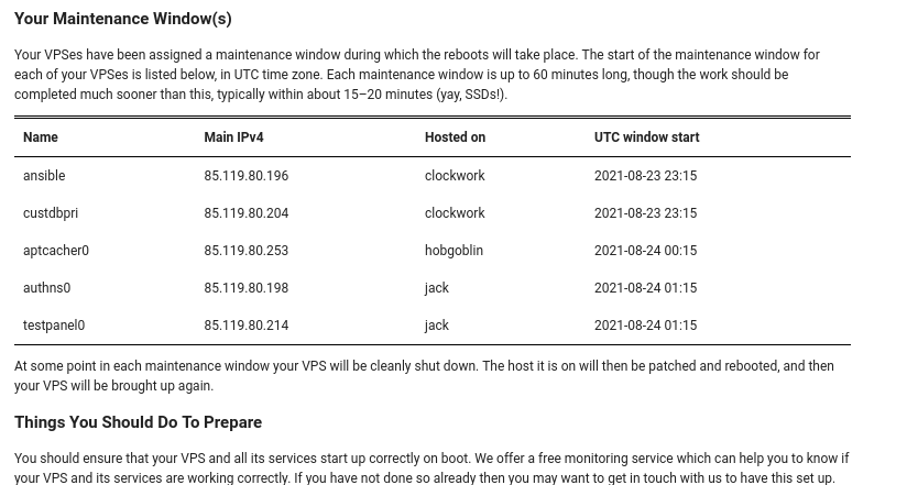 ## Your Maintenance Window(s) ## Your VPS has been assigned a maintenance window during which the reboots will take place. The start of the maintenance window for your VPS is listed below, in UTC time zone. Each maintenance window is up to 60 minutes long, though the work should be completed much sooner than this, typically within about 15–20 minutes (yay, SSDs!). +-----------------+---------------+--------------------+ | Name | Main IPv4 | Window start (UTC) | +-----------------+---------------+--------------------+ | accountname | 85.119.x.y | 2021-08-25 01:45 | +-----------------+---------------+--------------------+